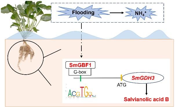 本研究通过整合基因组、转录组、代谢组和表型数据,构建了“水涝-NH4+-SmGBF1-SmGDH3-丹酚酸B”的完整调控链条。研究发现在淹水逆境下,丹参根部铵离子(NH4+)显著积累,激活了转录因子SmGBF1的表达。进一步机制解析表明,SmGBF1通过特异性结合谷氨酸脱氢酶基因SmGDH3启动子区的G-box顺式元件,直接调控其转录表达。功能验证实验显示,过表达SmGDH3可使丹酚酸B含量提升37.6%,同时显著增强丹参对淹水逆境的耐受能力。本研究揭示了环境因子通过转录调控网络影响药用植物活性成分积累的分子机制,还为丹参耐涝高酚酸新品种的定向分子设计育种提供了候选靶点。