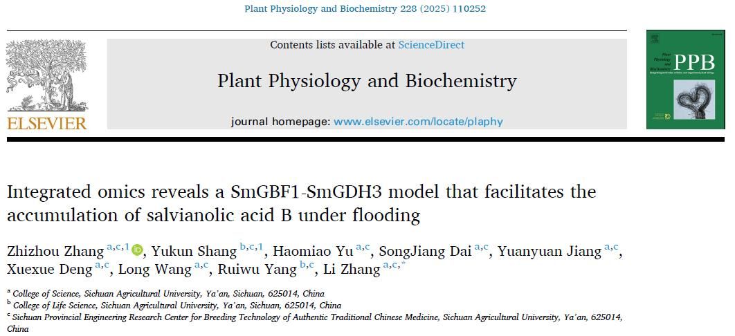 近日,我院“特色药用植物种质资源创新与利用”团队在植物学TOP期刊《Plant Physiology and Biochemistry》(IF=5.4)上发表了题为《Integrated omics reveals a SmGBF1-SmGDH3 model that facilitates the accumulation of salvianolic acid B under flooding》的研究论文。该研究是继课题组前期围绕“四川丹参的道地性成因”开展探索的延续。通过多组学整合分析,首次揭示了淹水逆境促进丹参活性成分丹酚酸B积累的分子调控模型,为解析中药材道地性形成的环境适应机制提供了新视角。