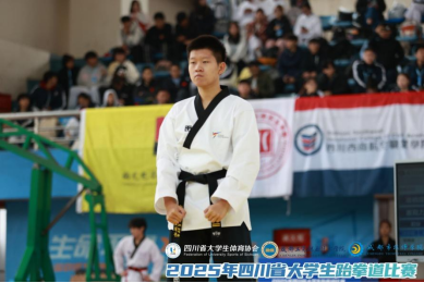 本次比赛由四川省教育厅指导,四川省大学生体育协会主办,吸引了省内37所高校的400余名运动员参赛。王致雄同学在赛场上充分展现了扎实的跆拳道技术功底与良好的竞技状态,其动作标准规范、节奏把控精准,将品势的力量与美感完美融合,最终在激烈角逐中脱颖而出,斩获金牌。