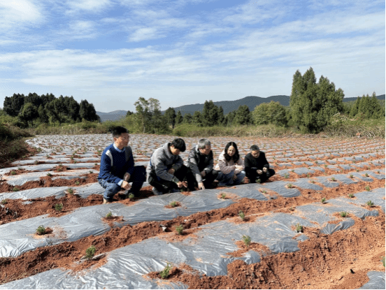 团队一行首先抵达德阳中国香山寿香谷迷迭香种植示范基地,实地考察基地建设运营、迷迭香种植规模及产业布局情况,现场指导迷迭香、百里香等植物的春播扦插、大棚育苗及种苗地栽等关键技术环节。通过与基地负责人、一线种植户深入座谈,团队详细掌握了当前迷迭香产业的发展现状——下游市场需求持续激增,覆盖单体药(迷迭香酸、鼠尾草酸等)、精油、香料、美妆护肤品等多个领域,但同时也面临优良品种匮乏、繁殖技术不规范、有效成分含量不稳定等产业痛点,亟需科研技术支撑破解发展瓶颈。座谈中,张利教授重点介绍了团队二十余年来在药用植物种质资源评价、新品种选育、生态栽培、活性成分提取及代谢工程改良等领域的科研成果,分享了以丹参为代表的药用植物基础研究与产业转化的成功经验,并结合基地实际需求,就迷迭香良种培育、标准化栽培及下游企业对接等工作提出针对性建议,为基地产业升级注入科研动能,也为后续校企共建、技术攻关奠定基础。