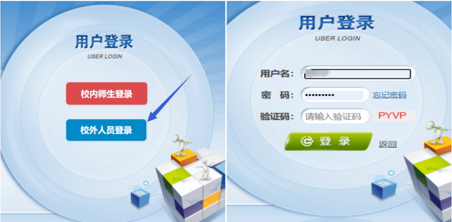 用户名:26+考研报名号(默认密码:身份证号码后6位。点击校外人员登录)