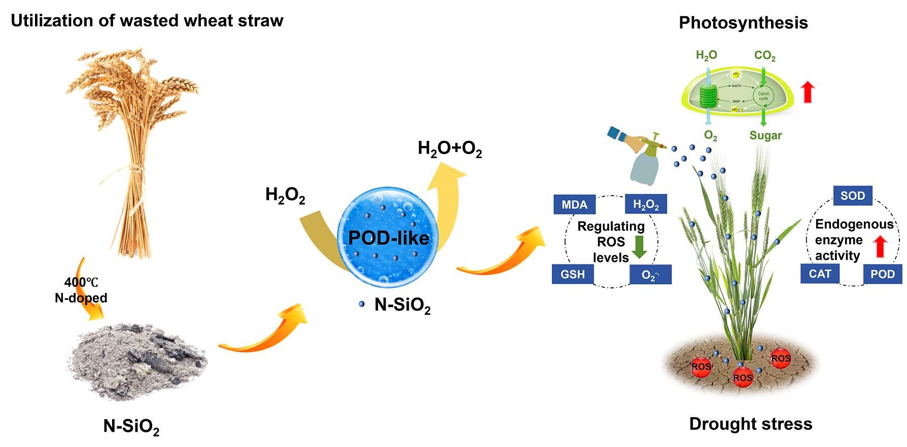 近日,四川农业大学理学院“功能纳米农业应用创新”学科培育团队在农业纳米生物技术研究方面取得重要进展。团队成功以废弃小麦秸秆为原料,“变废为宝”,通过绿色合成方法制备出新型氮掺杂二氧化硅(N-SiO2)纳米酶材料,显著提升了小麦在干旱胁迫下的抗逆能力,在ACS Materials Letters(中科院材料科学2区,IF =8.7)上发表了题为“The Alleviating Effect of Straw-Derived Nitrogen-Doped SiO2 Nanozymes for Wheat Growth under Drought Stress”(秸秆衍生N-SiO2纳米酶对干旱胁迫下小麦生长的缓解作用)的研究论文,这项研究为发展可持续农业、保障粮食安全提供了新的策略。
