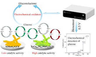 血糖监测是诊断和管理糖尿病的关键,精准检测葡萄糖在临床诊断中尤为重要。非酶葡萄糖传感器可有效克服酶传感器的局限性。本研究制备了一种氮、钴双掺杂的钼酸镍纳米材料(N-CoxNiyMoO4),系统考察了Co掺杂及Ni/Mo摩尔比对葡萄糖检测性能的影响。结果显示,N-Co0.5Ni0.5MoO4修饰材料具有更高的电催化活性,包括增强的氧化还原性能、更快的电子转移速率,且电阻约为对比样品的0.65倍。同时,三金属协同体系还将葡萄糖氧化电位降低约0.07 V,并在碱性介质中更有效地催化葡萄糖氧化。该传感器在1.0 μM— 0.5 mM和0.5 mM —5 mM的宽范围内,电流强度与葡萄糖浓度呈现出良好的两段线性关系,检测限分别为8.0 nM和53 nM(信噪比S/N = 3),同时具有高灵敏度(2368 μA mM-1 cm-2和378 μA mM-1 cm-2)、良好的选择性和稳定性。其在实际样品应用中表现良好,检测结果与家用血糖仪相当,加标回收法的回收率为92.79 % - 107.52 %,显示出巨大的应用潜力和广阔的应用前景。